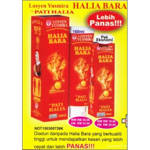 - Membantu merawat demam. Losyen Halia Bara Yusmira HARGA RM 3000 Losyen Yusmira Halia Bara Plus Pati Halia sesuai untuk melembut menyegarkan kulit serta mengembalikan bentuk tubuh badan yang cantik dan menawan. YUSMIRA LOSYEN PATI HALIA COLLAGEN GOLD B RM 3600 RM 2340.